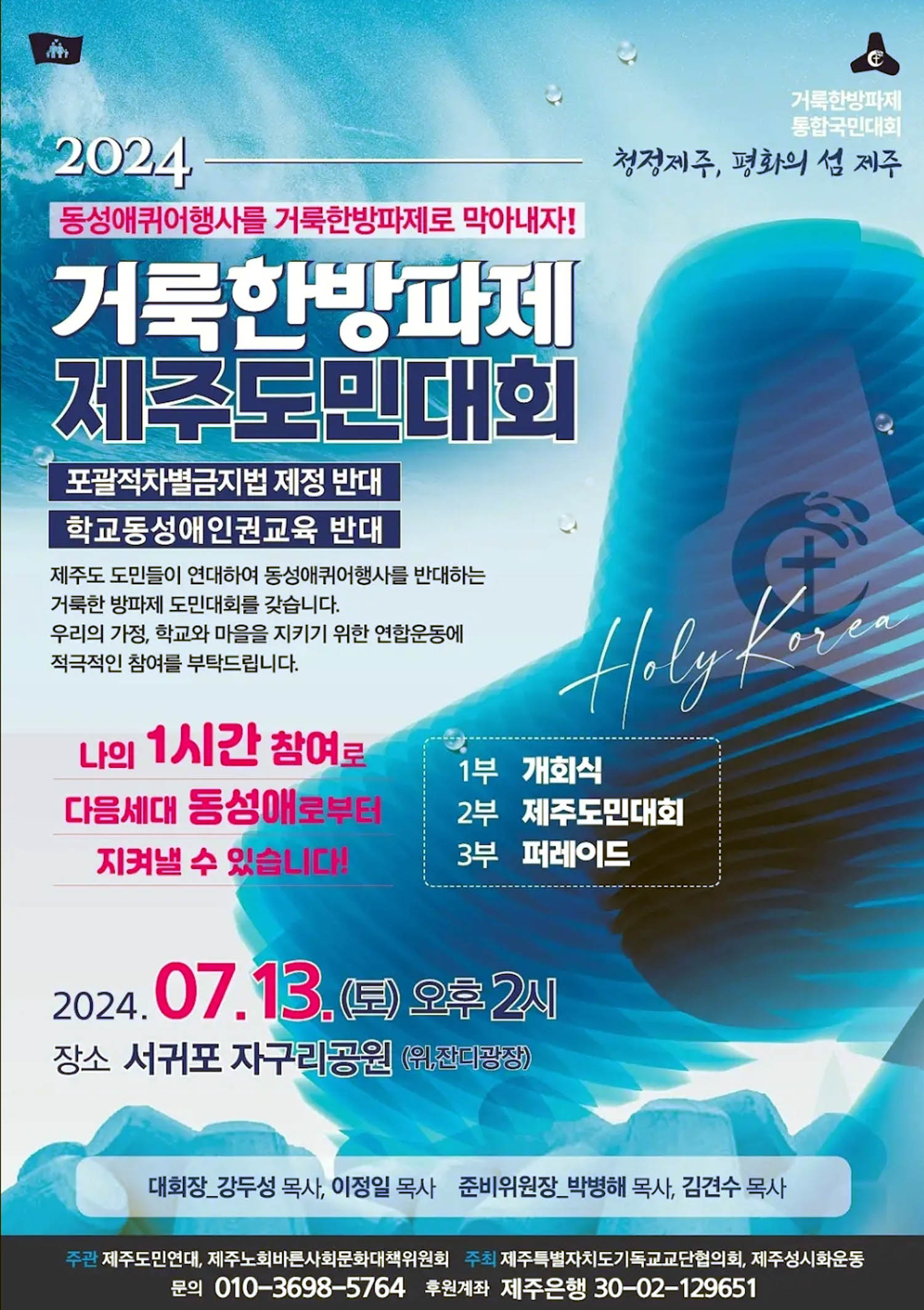 제주도민연대는 2024년7월13일(토)오후2시 서귀포시 자구리공원에서 열리는 퀴어행사를 반대하는 집회를 "거룩한방파제"라는 타이틀로 청정의 제주 섬을 지켜내고 다음세대들의 교육에 악영향을 주는 동성애 행사를 적극적으로 반대하기 위해 집회를 가졌다. 전날 밤 12시 이후 동성애 반대측이 게시한 현수막을 누군가 칼로 다 훼손해 버려서 경찰이 수사에 나섰고 여성 용의자를 체포해서 수사를 벌이고 있다.